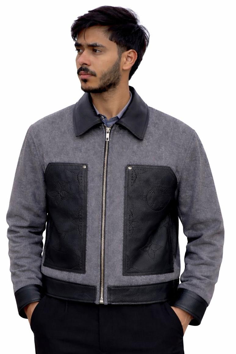 This chic grey blouson elevates a workwear silhouette with Monogram-adorned calfskin leather details. The soft moleskin body features leather and a leather yoke on the back, which have been meticulously perforated with holes in varying sizes to create a delicate Monogram Macro motif. Both timeless and modern, this is a perfect buy-now-wear-now piece.